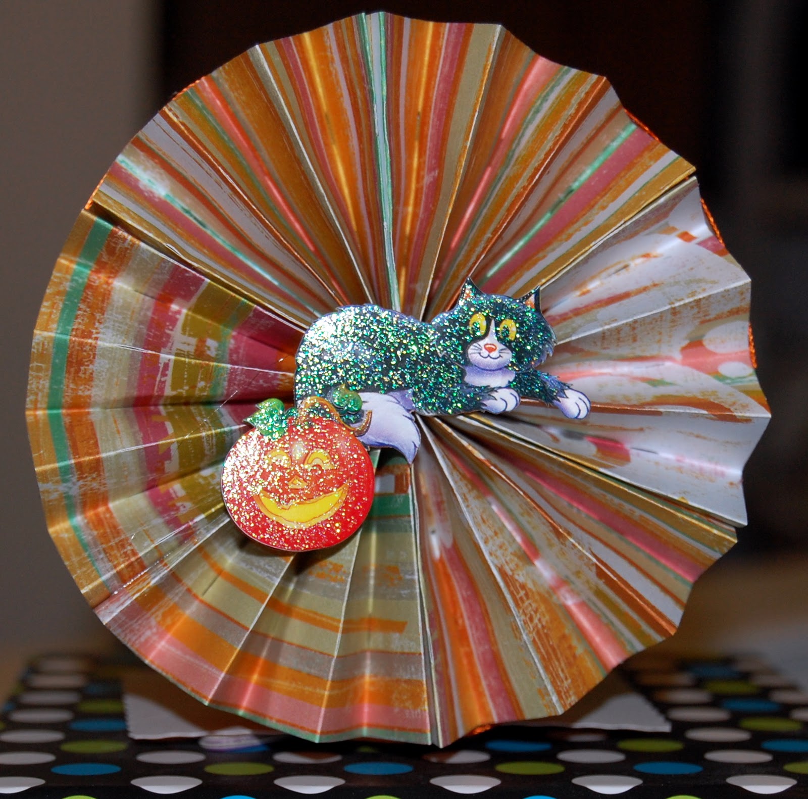 I took a peanut can and wrapped it in Halloween paper. The rosette on top I made with my Cricut but you can make on using a scoring board such as the Martha Stewart scoring board. The stickers and paper were just lying around in my Halloween drawer so I can't tell you the name brands.