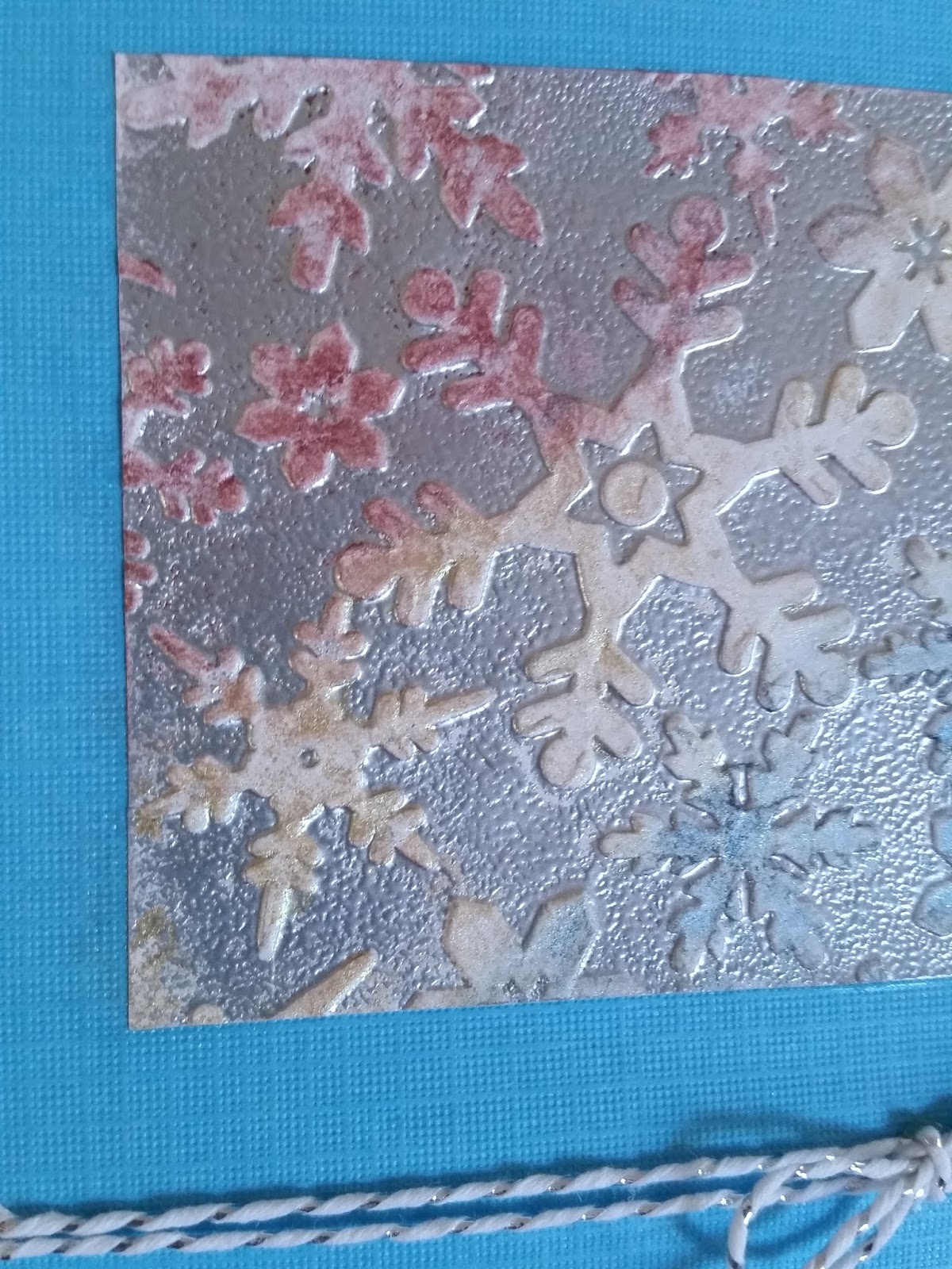 Here is a close up of the area I did. I used colored mist spray to color the snowflakes. I put used cardstock over each area I didn't want spritzed.